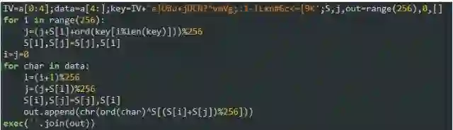 收到的内容被RC4 密码加密过,一般的网络检测设备只能看到内容,但是无法研究或者扫描。只有脚本有密钥。而此次我们收到的是另一段Python代码,可用RC4 密码解密,解密后立即执行。