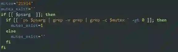 下载的bash脚本会通过测试之前定义的mutex(互斥体,21915)是否存在,来检查该机器是否已被感染。如果存在,则终止,否及将绕一圈继续执行。