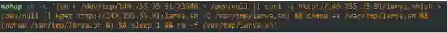 Zealot会通过几种方法来捕捉该脚本。首先,它会通过TCP 插口链接一个远程服务器,将收到的数据重新导向shell。如果失败,Zealot将使用“curl”和“wget”工具下载并执行一个名为“larva”的文件,然后立刻删掉。
