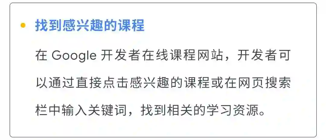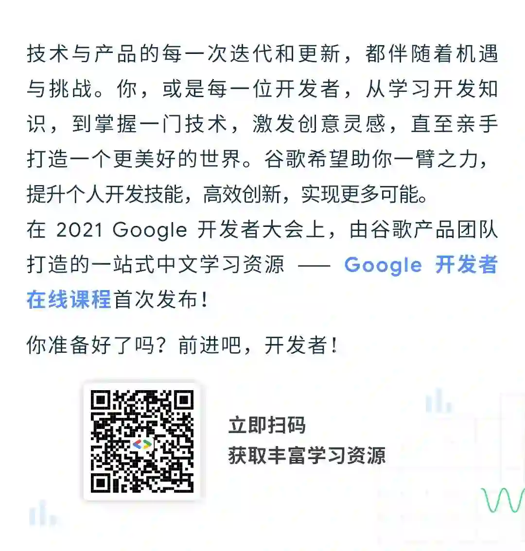 想通过深入学习,获得全方位成长?想提升开发技能,在开发的舞台上绽放自己的光芒?快登陆 Google 开发者在线课程,开启你的学习之旅吧!前进吧,开发者!
