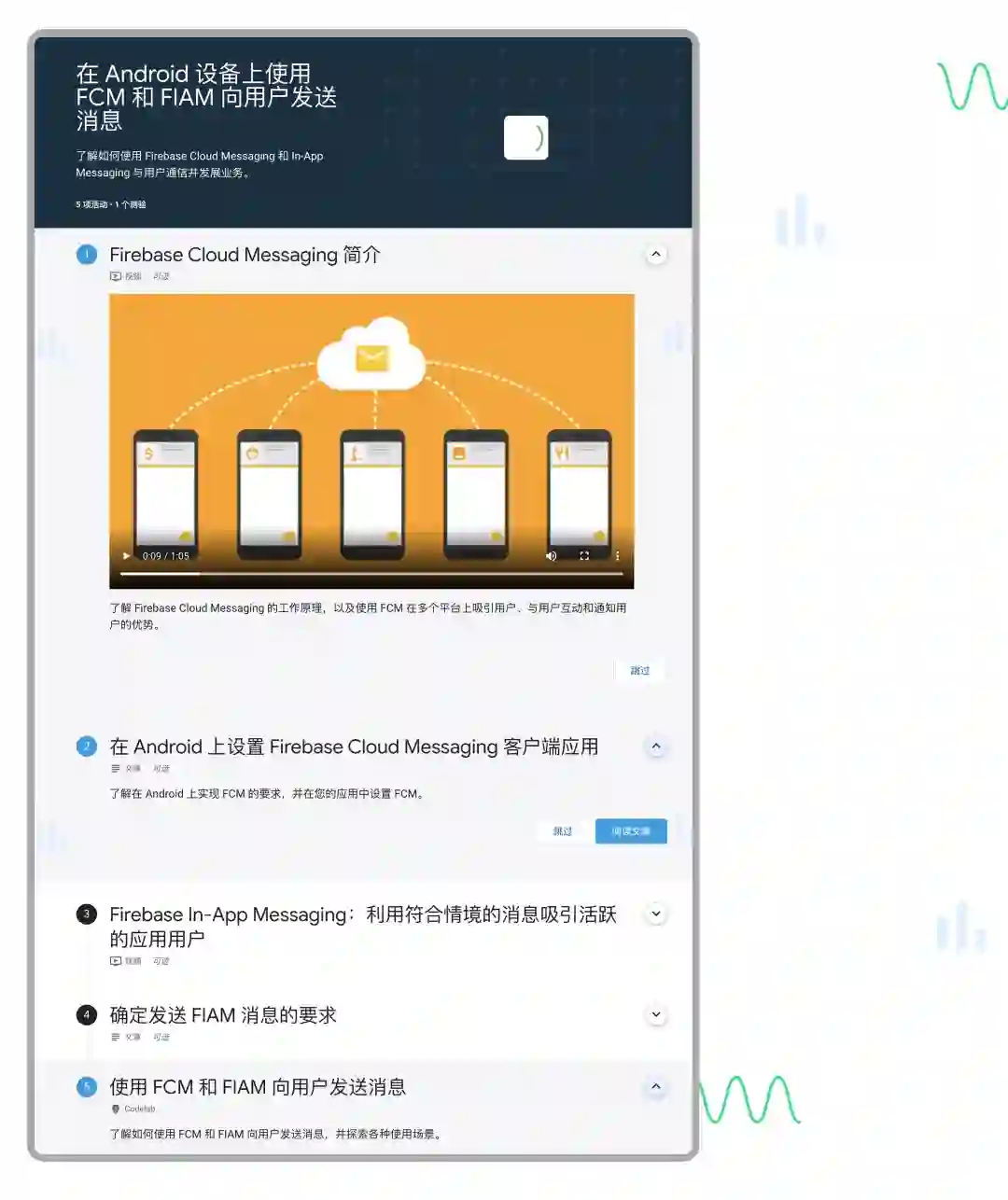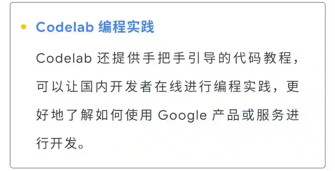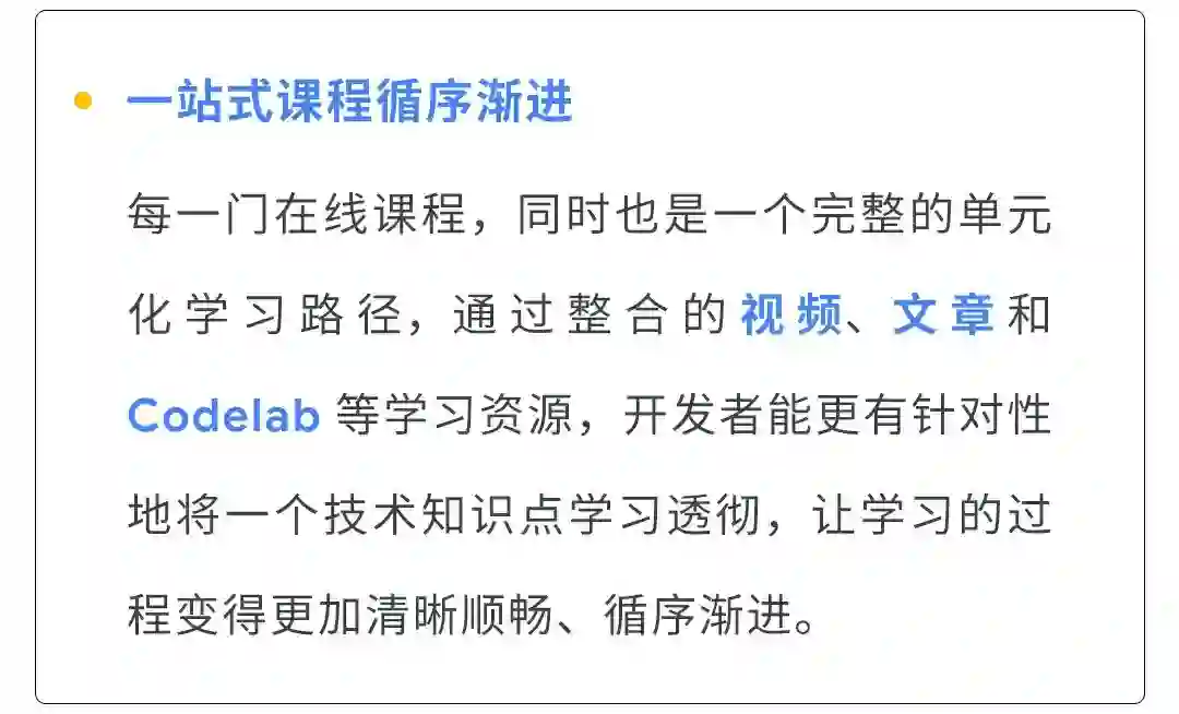 Google 开发者在线课程 是由 Google 产品团队打造的免费中文在线课程,包含 80+ 文章、110+ 视频深度解析、170+ 引导式编程练习 (Codelab),覆盖 10+ 项 Google 产品或服务。开发者可以借助循序渐进的课程,按自己的节奏学习知识,提升开发技能。