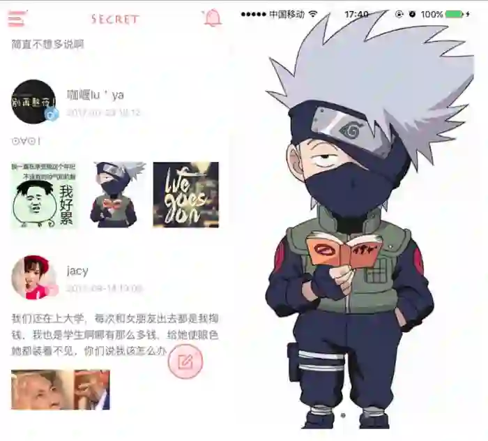 所有操作都是匿名的。你发什么、评论什么都不用担心别人知道你是谁,当然,违规的东西会被屏蔽。