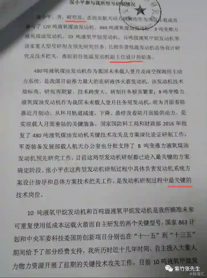 公文称,离职前,张小平任西安航天动力研究所低温发动机副主任设计师职务。