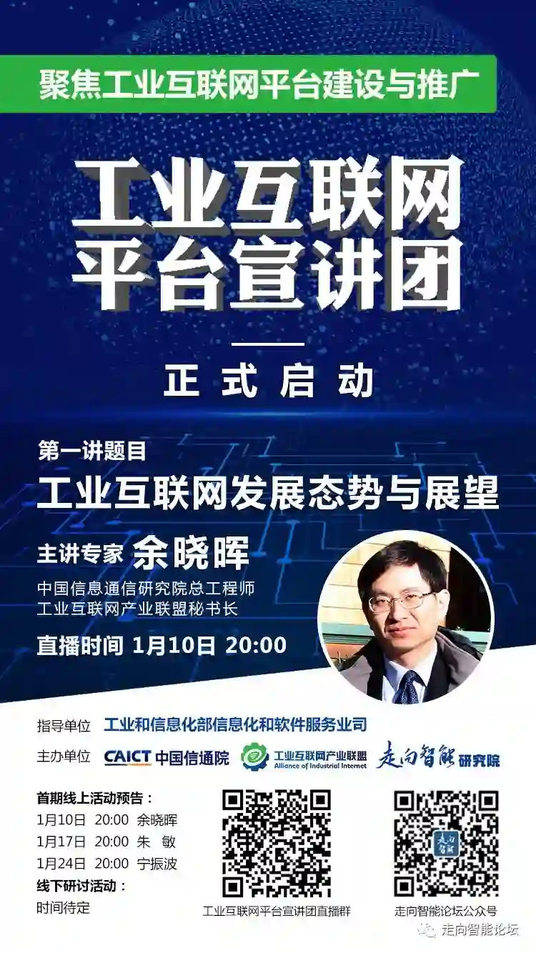 1月10日周三晚20点,工业互联网平台宣讲团即将开讲!中国信息通信研究院总工程师、工业互联网产业联盟秘书长余晓晖为大家分享"工业互联网趋势与展望”。欢迎大家免费参与网络宣贯活动。
