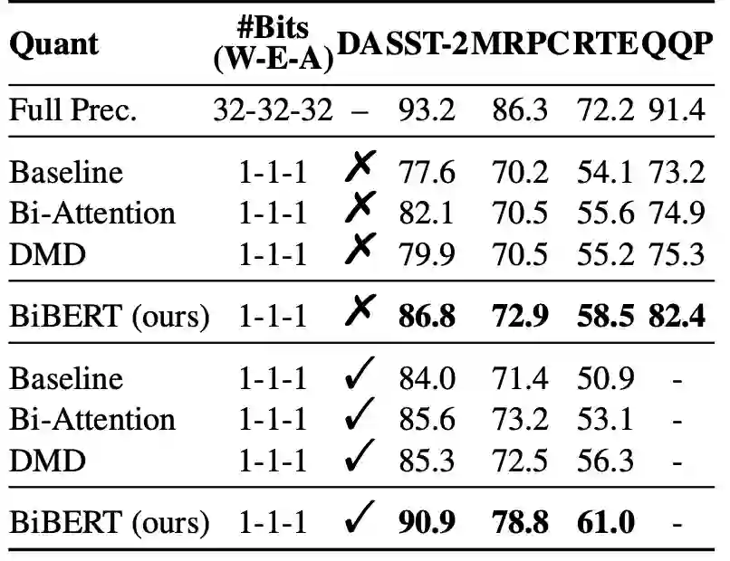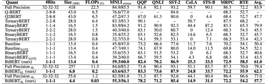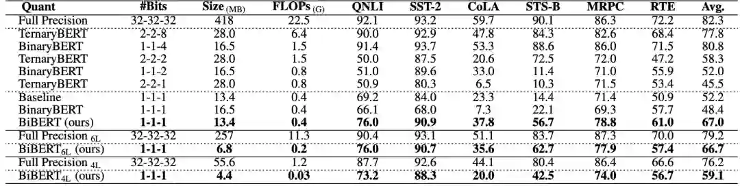 BiBERT首次证明了BERT模型全二值化的可行性,在GLUE数据集上的准确性极大地超越了现有的BERT模型二值化算法,甚至超过了更高比特表示的模型。