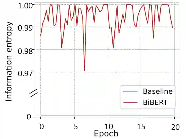 我们的研究表明,在BERT模型的注意力机制中,softmax函数得到的归一化注意力权重被视为遵循一个概率分布,而直接对其进行二值化会导致完全的信息丧失,其信息熵退化为0(见图2)。