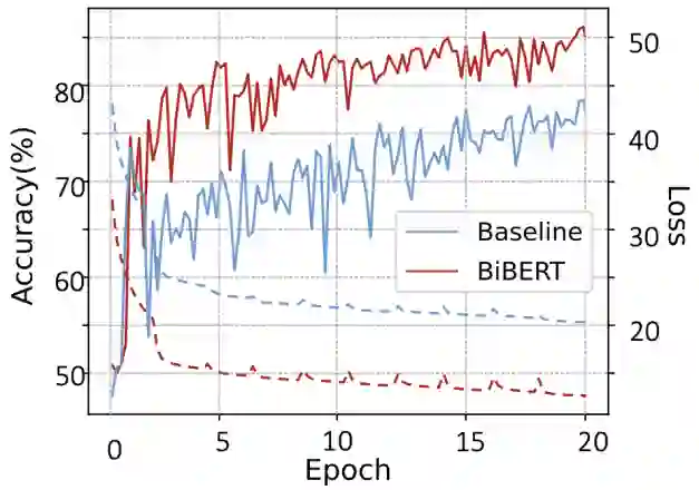 同时,作者绘制了训练时的loss下降曲线和准确率,BiBERT相比于基线明显更快收敛、准确性更高。