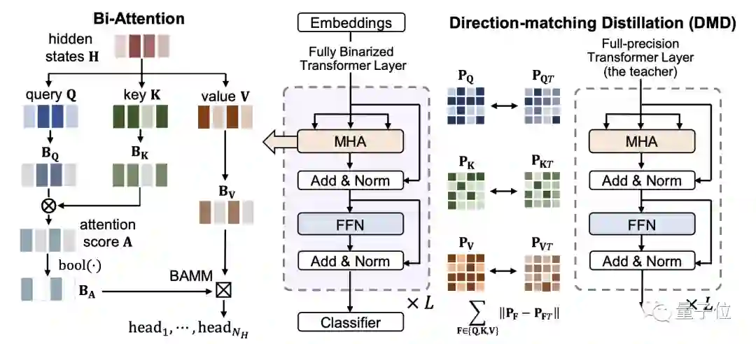 我们研究了BERT模型在二值化过程中的性能损失,作者在信息理论的基础上引入了一个高效的Bi-Attention(二值注意力)机制,解决前向传播中二值化后的注意力机制的信息退化问题;提出方向匹配蒸馏(Direction-Matching Distillation)方法,解决后向传播中蒸馏的优化方向不匹配问题。