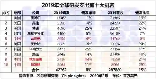 听起来越来越高端了,但这些研发创新的背后也是大量的研发投入。芯思想研究院(ChipInsights)发布数据显示,在2019 年研发支出前十大半导体公司,英特尔的研发支出远远超过其他所有半导体公司,达到 134 亿美元,占到总营收的19%。相比之下,高通为54亿,主要竞争对手英伟达为28亿。