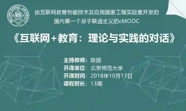 《互联网+教育:理论与实践的对话》是由北京师范大学陈丽教授主持、互联网教育智能技术与应用国家工程实验室联合开发的,基于联通主义理论的cMOOC课程。课程以“开放”、“共享”、“互动”、“创新”为指导,关注互联网推动教育创新的实践策略和创新理论,旨在帮助所有参与者建立起个人与典型创新企业、研究机构、关键人物、文献资源之间的连接,形成互联网教育领域的社会联通网络,并最终建构出包括研究者、企业创新实践者、管理人员在内的互联网教育领域的综合性高端研究社区。