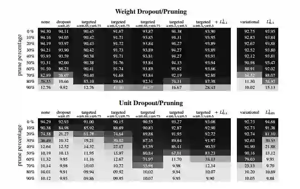 想必,大家都对Dropout有所了解了吧,它已经是许多经典网络的标配,主要操作是随机删除部分神经元获得不同的输出。而新的方法——Targeted Dropout其实很类似于将剪枝嵌入到了学习过程,因此训练后再用剪枝操作会有更好的性质。