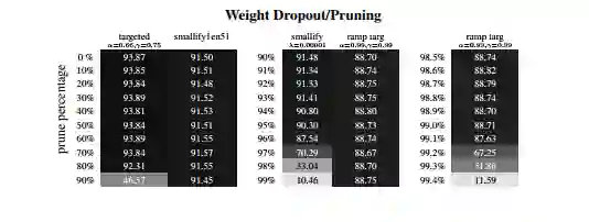 实验在CIFAR-10上使用ResNet-32。其中左图为三次targeted中最好的结果与 6次smallify中最好结果的对比,中间图为检测出最高的剪枝率,右图为ramping Tageted Dropout检测出的更高剪枝率。