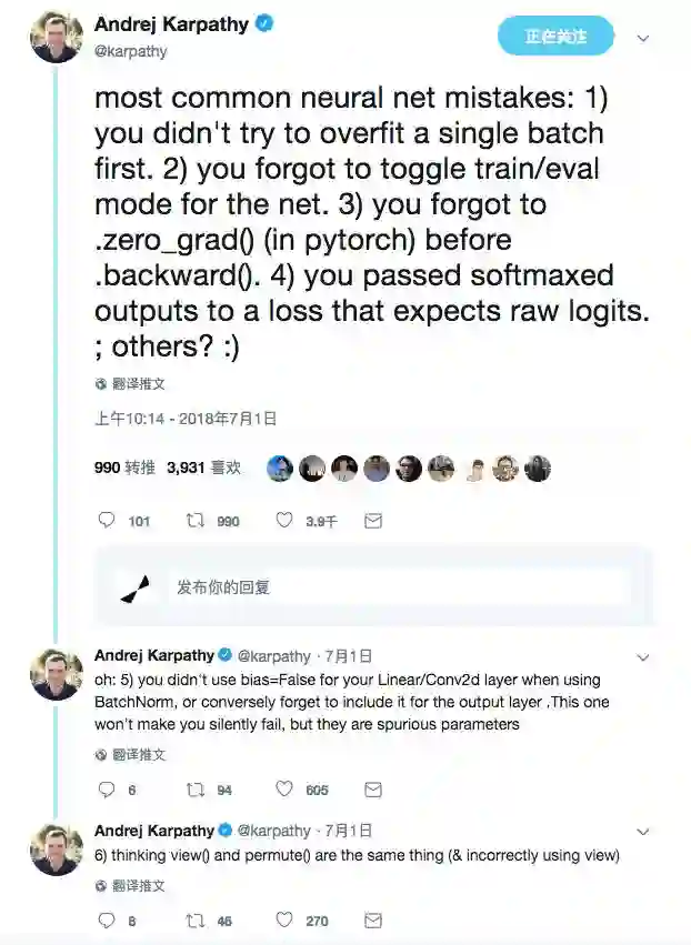众所周知,机器学习,特别是深度学习模型和强化学习模型,很难调试。Andrej Karpathy曾发推列举一些常见的犯错情况: