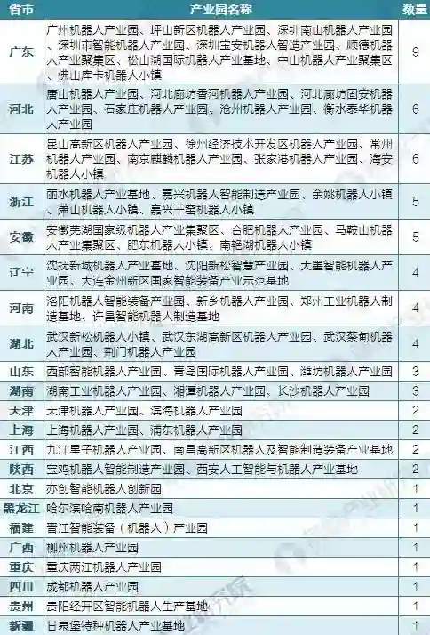 长三角和珠三角地区是中国汽车制造业、电子制造企业集中地,也是重要的机器人自动化公司集聚地,依托庞大的制造业建立了20多个机器人产业园,其中尤以广东省数量最多。