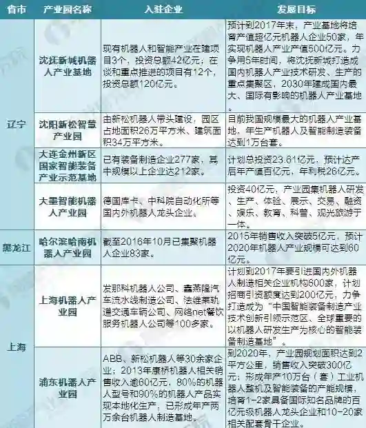 东北作为老工业基地, 是我国最早从事于工业机器人生产的地区,培育出新松公司这样的机器人第一家上市公司,占据国产工业机器人三分之一的市场份额。目前东北共有4个机器人产业园,分别是辽宁的沈抚新城机器人产业基地、沈阳新松智慧产业园、大连金州新区国家智能装备产业示范基地、大墨智能机器人产业园,和黑龙江的哈南机器人产业园。
