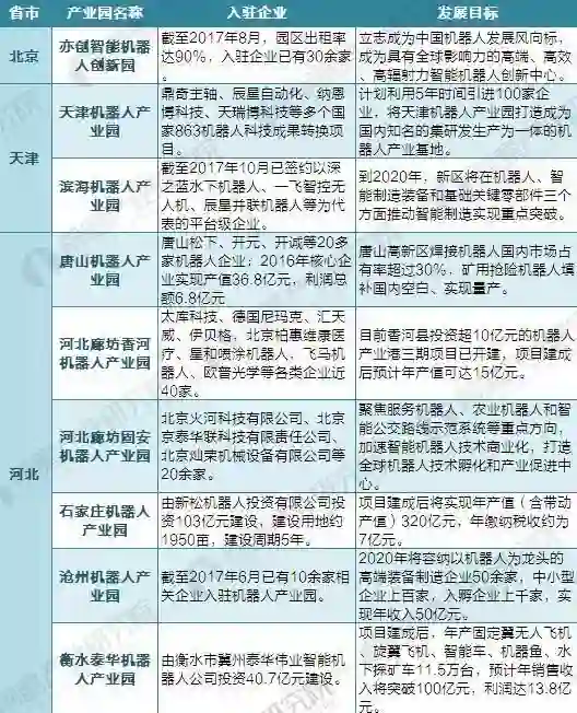 京津冀地区机器人产业具有技术优势,覆盖领域包括工业机器人及其自动化生产线、工业机器人集成应用等产品和服务。其中,天津市支持工业机器人、警用机器人、安全机器人、矿山机器人、水下机器人、医用微创机器人的研发及产业化;河北则以焊接机器人、矿用抢险机器人、农业机器人等特色机器人为主。