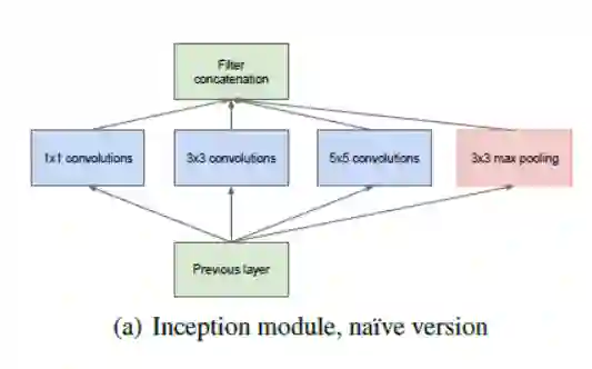 如上所见,这是从我们以前看到的顺序架构的一个巨大的变化。在单层中,存在多种类型的“特征提取器”。这间接地帮助网络表现更好,因为训练网络本身在解决任务时有许多选择。它可以选择将输入进行卷积,也可以直接将其合并。