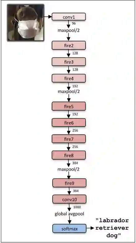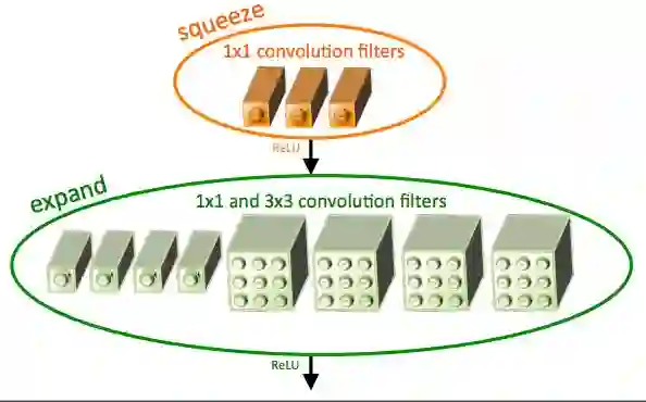 squeezeNet架构是一个更强大的架构,在移动平台等低带宽场景中非常有用。这个架构只占用了4.9MB的空间,另一方面,开始占用〜100MB!这种剧烈的变化是由一个称为火灾模块的专门结构引起的。下图是消防模块的图示。