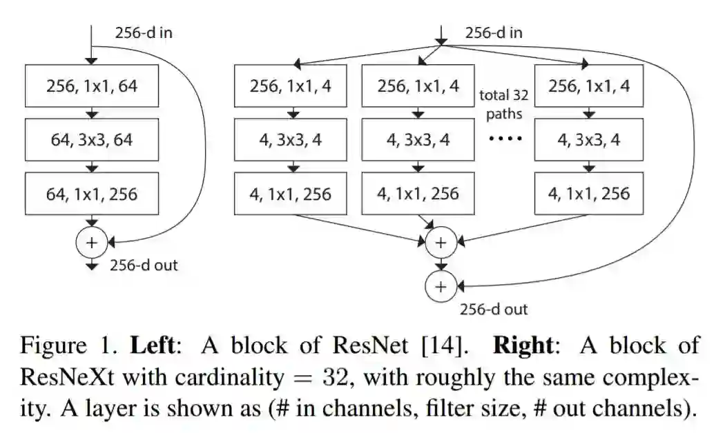 ResNeXt被认为是当前最先进的物体识别技术。它建立在起始和重新设计的概念之上,以实现一种新的和改进的建筑。下图是对ResNeXt模块残余模块的外观进行总结。