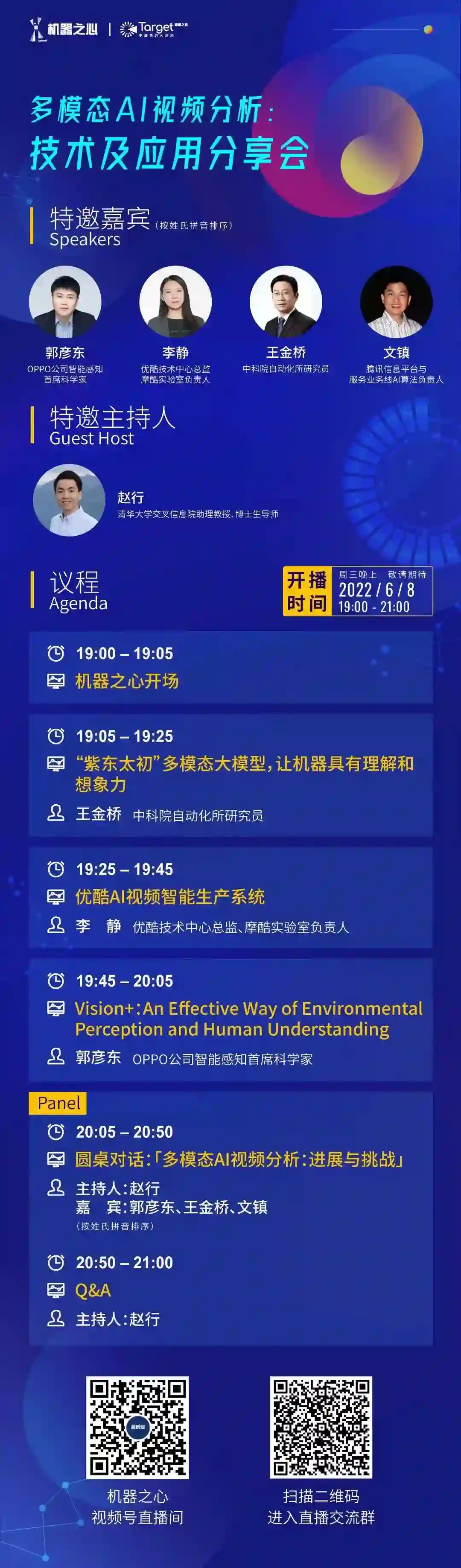 分享嘉宾与主题介绍 主题一:“紫东太初” 多模态大模型,让机器具有理解和想象力嘉宾简介:王金桥,中国科学院自动化研究所研究员,博士生导师,中国科学院大学人工智能学院教授。主要从事预训练大模型、目标检测与识别、视频分析与理解等方面的研究,共发表论 280 余篇,获得国内竞赛冠军 20 余项。 分享摘要:本次将介绍千亿参数多模态预训练大模型 “紫东太初”,它开拓性地实现了图像、文字、语音和视频等不同模态数据的统一表示和互相生成,兼具理解和生成认知能力,并实现了在媒体理解、人机对话等多场景的落地应用。 主题二:优酷 AI 视频智能生产系统 嘉宾简介:李静,博士,优酷技术中心总监,摩酷实验室负责人。法国南特大学计算机博士,曾任法国国家科学院研究员。2019 年加入阿里巴巴。研究方向多媒体视觉体验质量评价,3D 视觉,机器学习等。为多个国际、欧盟、国内专家组和标准组成员。参与制定多个 IEEE 以及 ITU 国际标准,担任多个国际期刊与会议主编以及评审。 分享摘要:优酷 AI 视频智能生产系统,基于自有 IP 版权内容,从视频、音频、弹幕等多模态信息中提取看点和标签,沉淀图片、镜头、片段级看点素材形成素材库,通过自研算法具备根据不同内容创作模板进行加工与视频剪辑合成的能力,同时可自动配合相应标题与封面图,满足人机配合高效创作精品、以及自动化批量生产满足优酷内容需求的分级智能生产系统。 主题三:Vision+:An Effective Way of Environmental Perception and Human Understanding 嘉宾简介:郭彦东,OPPO 公司智能感知首席科学家,对应技术委员会以及智能驾驶负责人,北京邮电大学兼职教授。郭博士致力于计算机视觉与人工智能的学术研究,也注重在工业界的应用。他的论文被广泛接收在 CVPR、ECCV 等国际认可的学术会议期刊,同行引用数千次,赋能了 GE、HP、Microsoft、小鹏汽车、OPPO 等公司的多款核心产品。 分享摘要:OPPO 讨论了视觉信号与其他模态的信号融合的不同方式,包括声音、文字、激光雷达,以及多路视频的相互融合方式。通过场景化的设计具有融合作用的神经网络架构,实验展示了视觉信号可以融合其他模态来提高识别效果,也可以与文字一起进行有效的联合预先训练(特别是分割场景),多路视觉信号对于 3D 立体重建,特别是人体重建,有非常好的效果。 圆桌对话嘉宾与主题介绍 圆桌对话主题:「多模态 AI 视频分析:进展与挑战」 特邀主持人: