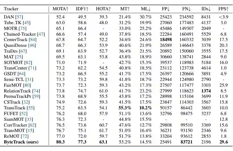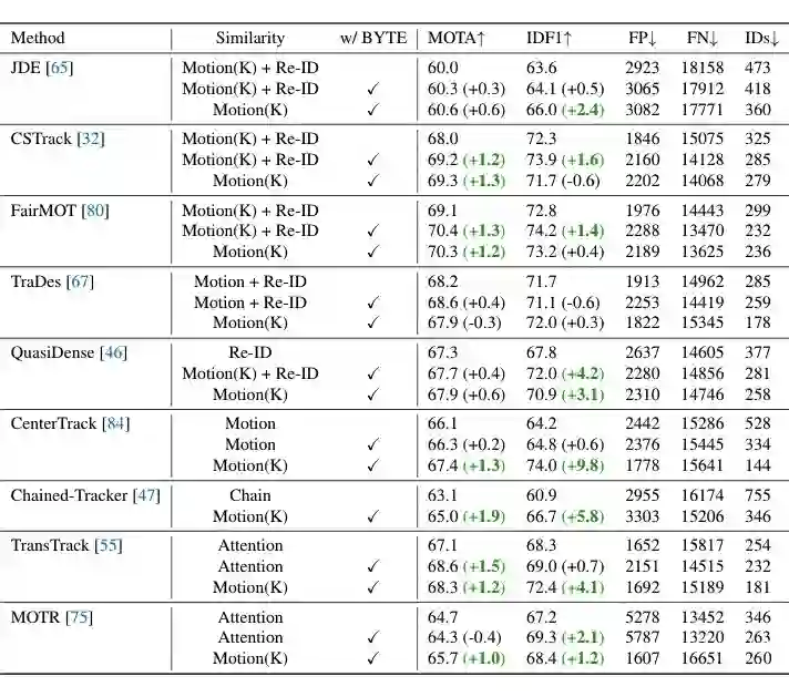 其次,我们将 BYTE 应用到了 ECCV20 之后的 9 种 SOTA tracker 上,其中包括基于 ReID, motion 和 attention 的方法,都得到了稳定的 MOTA 和 IDF1 指标的提升,结果如下表所示: