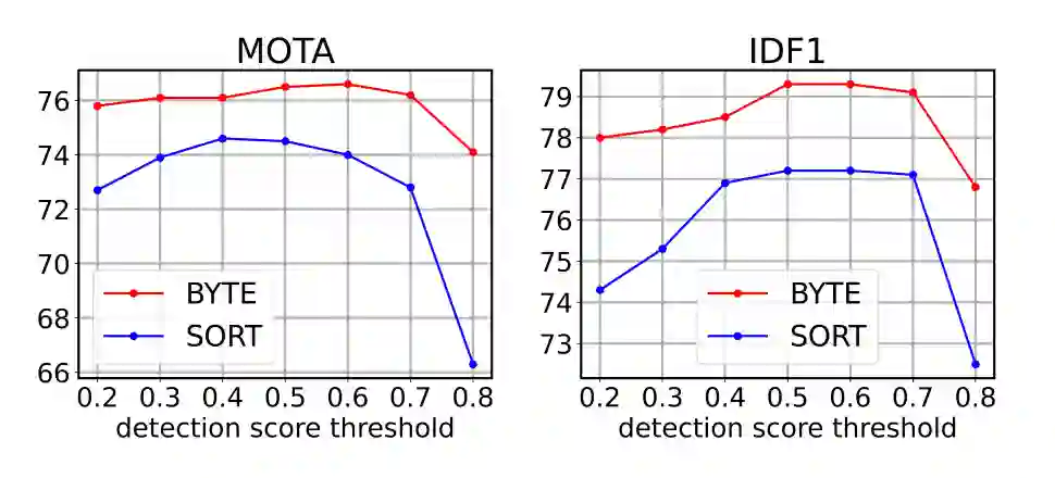 我们认为,BYTE 能 work 的原因是遮挡往往伴随着检测得分由高到低的缓慢降低:被遮挡物体在被遮挡之前是可视物体,检测分数较高,建立轨迹;当物体被遮挡时,通过检测框与轨迹的位置重合度就能把遮挡的物体从低分框中挖掘出来,保持轨迹的连贯性。