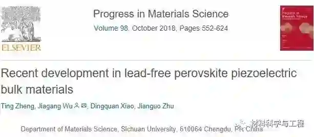 近日,材料科学与工程学院吴家刚教授团队在国际材料科学领域顶尖综述期刊《Progress in Materials Science》(IF=23.75,5年期影响因子为33.19) 发表了题为“Recent Development in Lead-free Perovskite Piezoelectric Bulk Materials”的90页长篇综述论文,四川大学作为唯一署名单位。这是该团队在该期刊发表的第二篇文章,也是四川大学作为第一单位在该期刊上发表的第三篇文章。论文第一作者为博士研究生郑婷(我校博士研究生作为第一作者首次在该期刊发表),通讯作者为吴家刚教授。