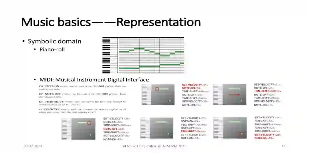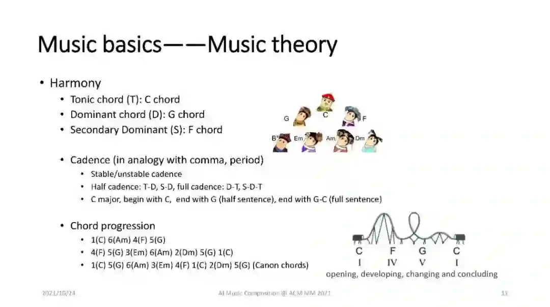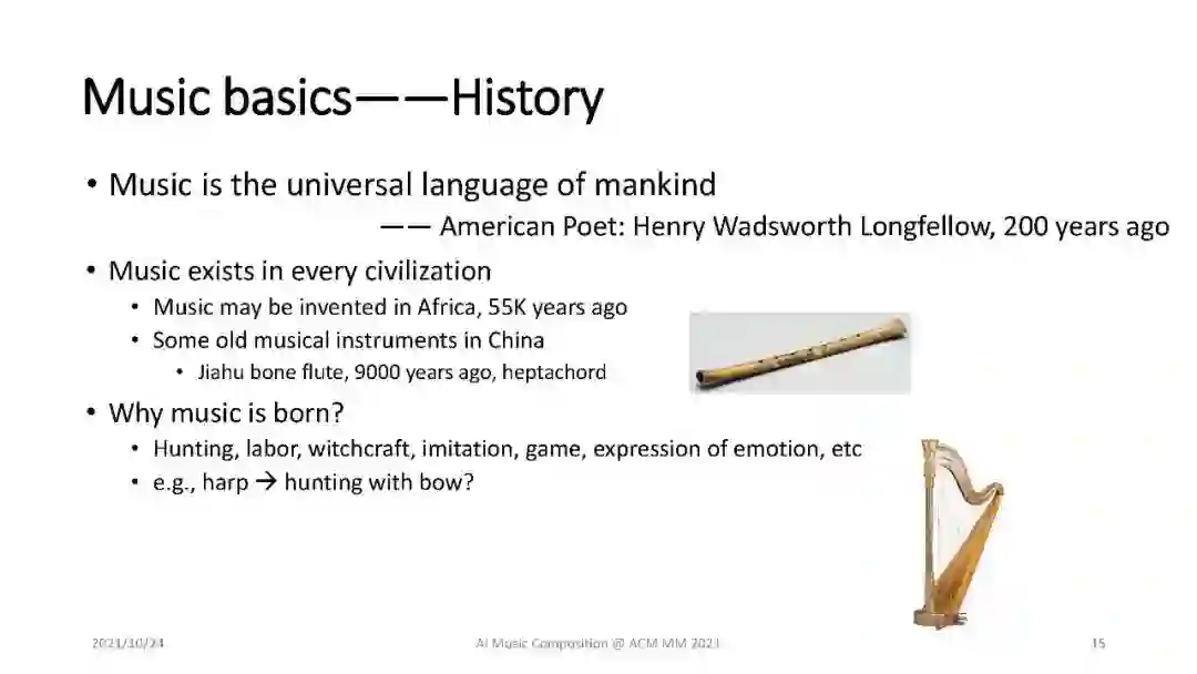 人工智能作曲是人工智能、音乐和多媒体领域最具吸引力和重要的课题之一。人工智能作曲的典型任务包括旋律生成、歌曲创作、伴奏生成、编曲、演奏生成、音色渲染、声音生成、歌唱声音合成等,涵盖了不同的形式(如象征性乐谱、声音等),与ACM多媒体的主题非常匹配。随着内容创作、深度学习等人工智能技术的快速发展,基于人工智能的音乐创作取得了快速的进步,但也遇到了很多挑战。对于从事人工智能、音乐和多媒体工作的广大听众来说,全面介绍和回顾人工智能作曲的基础知识、研究进展以及如何应对挑战是及时而必要的。在本教程中,我们将首先介绍人工智能作曲的背景,包括音乐基础知识和作曲深度学习技术。接下来我们将从两个方面介绍人工智能作曲:1)关键组件,包括乐谱生成、音乐表现生成和音乐声音生成;2)高级主题,包括音乐结构/形式/风格/情感建模,音色合成/转换/混音等。最后,提出了人工智能作曲的一些研究挑战和未来发展方向。本教程既适用于从事人工智能作曲的学术研究人员,也适用于从事人工智能作曲的行业从业者。