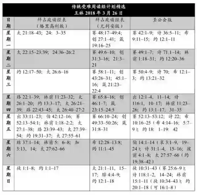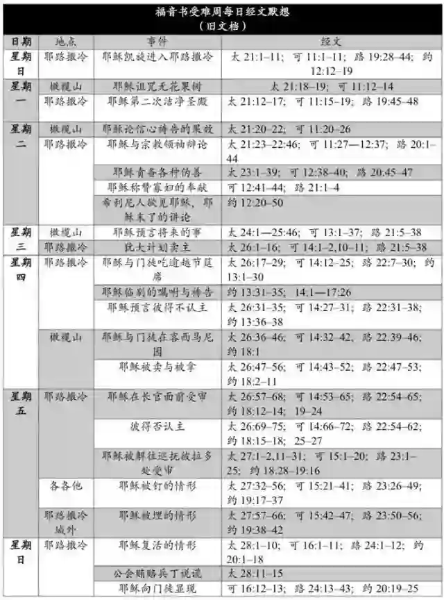《圣公会读经表》则既有福音书对耶稣行程的记载,也有《以赛亚书》的神学观点,同时还引用《诗篇》的灵修,以及新约书信中对“圣受难周”的反思,也相当有特色。