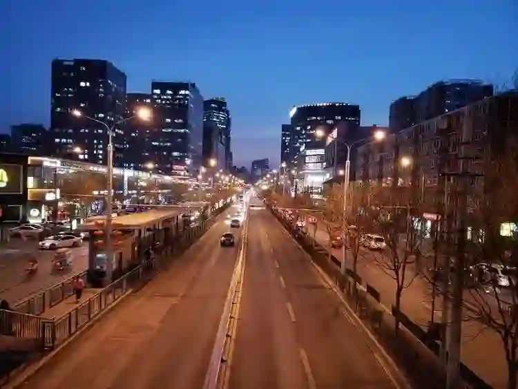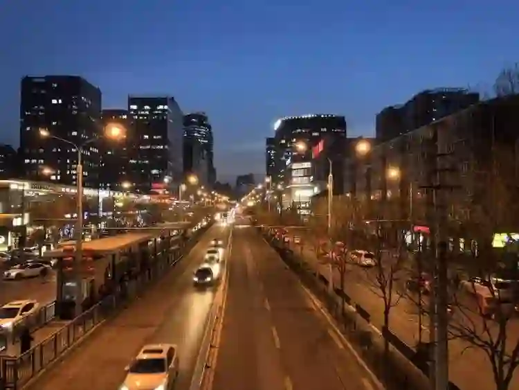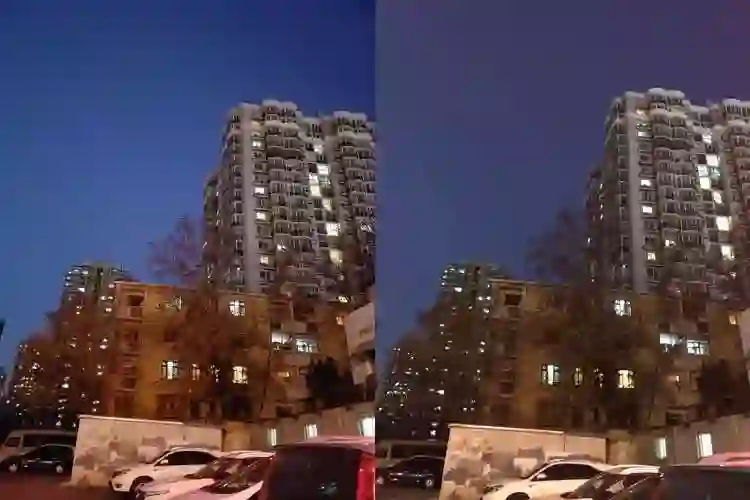 这两张照片拍摄于晚上 9 点左右的北京,肉眼看到的实际亮度比样张中还要低一个等级,树后面的楼房细节因为光线太暗,用肉眼其实是看不清的。这说明目前的旗舰手机拍夜景的亮度都很高了,最大的差距在于画面的纯净度。