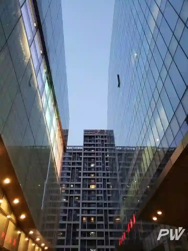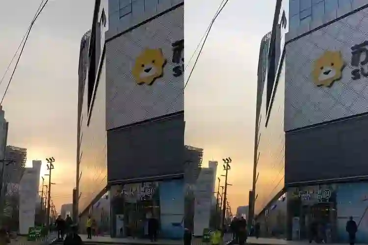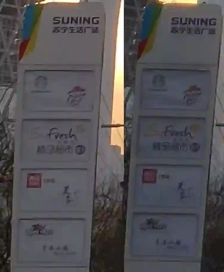 从实际的拍照体验来看,白天光线充足的环境中,S9+ 和 iPhone X 差距并不大,属于手机拍照中“神仙打架”的级别。比如这张在下午五点同一个角度拍摄的照片,无论是苏宁生活广场广告牌,还是逆光场景中的大楼,观感都很接近。