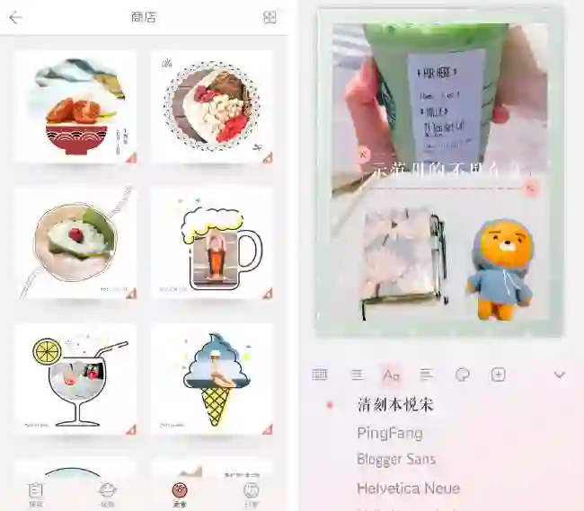 顾名思义,拼图酱主打的功能就是拼图,它内置了丰富的布局版式,在商店里还可以下载更多有趣的模板。子图滤镜、添加文字、旋转图像等功能都比较实用,图片间距、画面留白等等许多细节都可以调整,就拼图这个需求来说,能够很好地满足了。