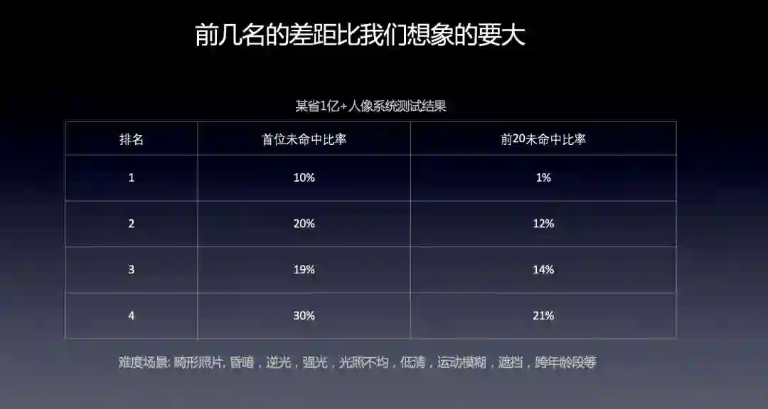 但实际上,这是典型的认知误区。我们在朱珑的演讲中看到了一张表,可能更准确的回答了这个问题,这是中国某省1亿人像库的情况下,真实的刑侦案件的破案环境的性能测试对比的表,参与方是知名的几大人脸识别公司: