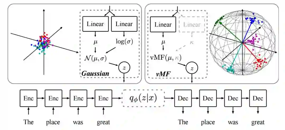 摘要:用于文本处理的变分自编码器(VAE)的一个特点是它们结合了强大的编码-解码模型(如 LSTM)和简单的潜在分布(如多元高斯分布)。这些模型存在一个困难的优化问题:在变分后验总是等于先验时,会陷入一种糟糕的局部最优状态,而且模型完全不会利用潜变量,这种「坍缩」是由目标的 KL 散度激励导致的。我们在研究中试验了潜在分布的另一种选择——von Mises-Fisher(vMF)分布,它将散点放置在单位超球面上。有了先验和后验的选择,KL 散度项就只取决于 vMF 分布的方差,此时我们就可以将其视为一个固定的超参数。我们证明了,这样做不仅可以避免 KL 坍缩,而且在一系列建模条件下(包括循环语言建模和词袋文档建模),始终能得到比高斯分布更好的表现。对 vMF 表征的性质分析表明,相比于高斯状态,这些性质在它们的潜在表征上能学习到更丰富、细致的结构。