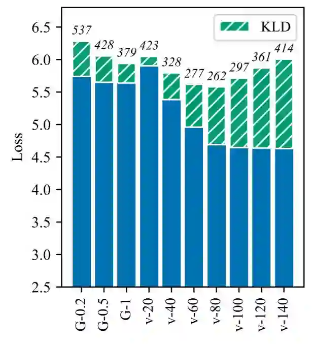 图 4:不同超参数下的高斯和 vMF-NVRNN 的比较。所有的模型都是在 Inputless 设置下在 PTB 上训练的,其中潜在维数为 50.G-α表明高斯 VAE 与 KL 由给定的常数α退火,V-κ表明 VAE 将κ设置为既定值。绿条反映的是 KL 损失的数量,总高度反映的是整个目标。竖条上的数字是困惑值。vMF 的可调性更强,在广泛的κ值范围内也能获得更好的结果。