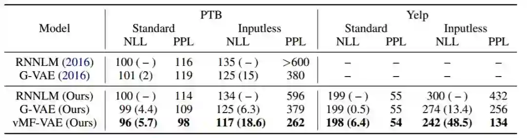 NVRNN 的实验结果如表 3 所示。我们在测试集中报告了负对数似然比(NLL)和困惑值(PPL)。我们遵循了 Bowman 等人(2016)的实验,该实验对高斯 VAE 的 KL 项权值做了退火处理;vMF VAE 不需要权重退火就能很好地工作。vMF 分布在 Standard 和 Inputless 设置的所有数据集中都使性能得到提升。即使在 Standard 设置下,我们的模型也能成功地使用非零 KL 值达到更好的困惑值,甚至没出现 KL 坍缩(如在 PTBStandard 设置中的 G-VAE)。可能由于优化存在困难,高斯分布会导致较低的 KL 和糟糕的的对数似然比。在 Inputless 设置中,我们看到了巨大的提升:与高斯 VAE 相比,vMF VAE 在 PTB 中将 PPL 从 379 降到 262,在 Yelp 中从 256 降到 134。