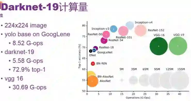 上面讲述了训练函数和训练对象,大家都需要先选择预训练函数。另外,对于YOLO 2来说,主要是想提高精度和速度,重点是base network要好。YOLO 2采用的是Darknet-19预训练模型。右图是在ImageNet上使用的一些模型,分别给出了他们的计算量和精度。在224x224的图片上,图中VGG16需要30.69个G-ops,基于GoogLeNet的YOLO需要8.52个 G-ops。而Darknet-19更小,G-opsS是5.58。
