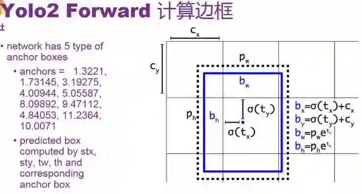 现在讲一下怎样把stx、sty、tw、th变成输出边框。如右图所示,里面的σ(tx)可以理解为stx,σ(ty)可以理解为sty。每一个输出的bbox是针对于一个特定的anchor,anchor其实是参考bbox的width及height。对于VOC来讲,产生了5个固定的参考。