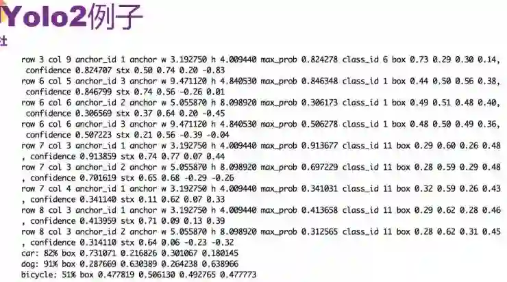 举一个例子,就是最前面那个有狗,有轿车,有自行车的图像,比较图中最后的三行就可以看出来,里面有轿车,狗和自行车,也能看到probability和bbox分别是什么,它们分别表示概率、大小和位置。具体来讲,从第一行,可以看出轿车的class_id为6,通过row和col可以看出大概的位置,还给出了anchor_id。第二行可以看到轿车的confidence和stx。