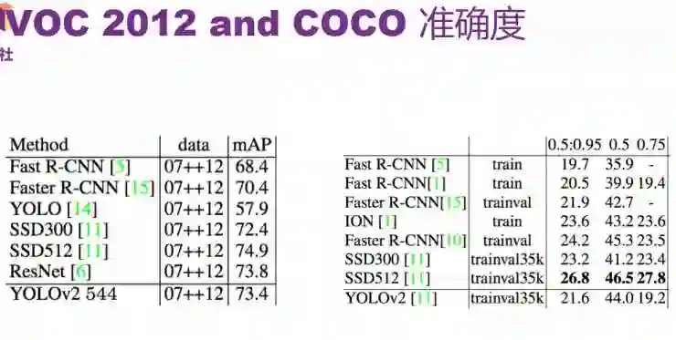 接下俩是在VOC 2012和COCO上的准确度,COCO是比VOC难的用于目标检测的benchmark,COCO里有80个类, VOC里有20个。从图中可以看出SSD的精度比YOLO 2要高,可能的原因是COCO里有比较小的物体。从图中也可以看出YOLO 2的速度依然很快。