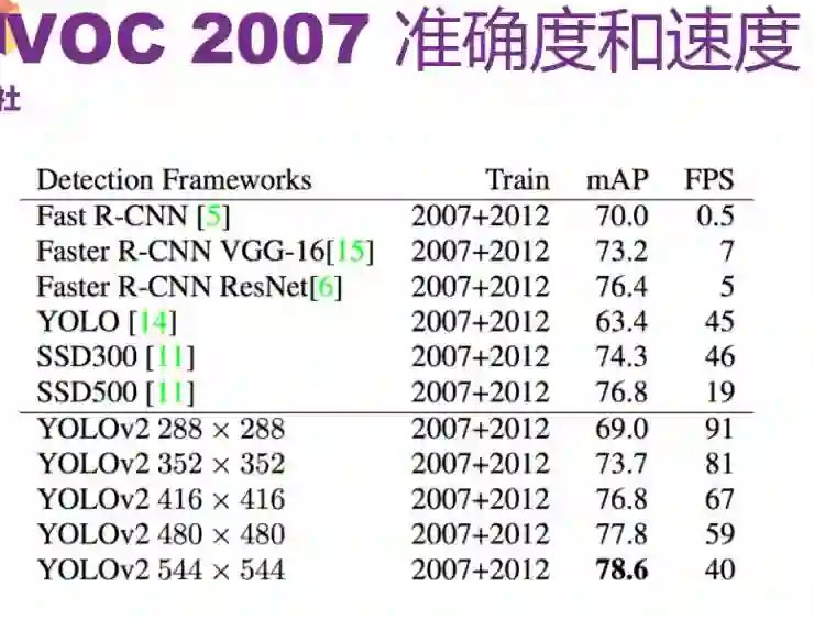 论文中列出了一些YOLO 2在标准目标检测集上的表现,由于YOLO 2网络只包含卷积层和池化层,因此可以接受任意尺寸的图像输入。从图中可以看到R-CNN和SSD的精度也是比较高的,但SSD是基于VCC-16来预训练,fps比较慢。YOLO 2的精度相对YOLO提高了很多,速度也有相应提升。对于YOLO 2,不同的图像大小也会产生不同的mAP。