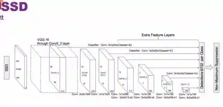SSD是当前最精确的一种目标检测算法,是基于单个神经网络。如图,前面几层是VGG网络,它主要是加入卷积特征层,得到不同尺度的特征层,从而实现多尺度目标检测。对于每个添加的特征层,使用一组卷积滤波器,可以得到一组固定数目的目标检测的预测 。