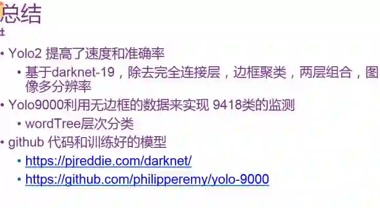 前面讲的就是YOLO2的部分,在一些小的物体的检测上不如ssd,但在精度、准确度上都和ssd很接近,最大的优点是非常快。