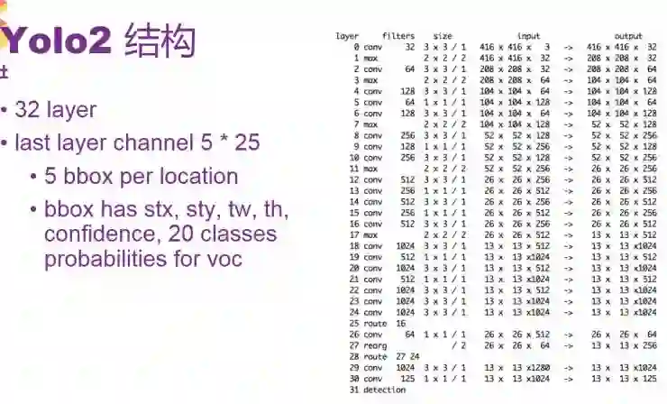 YOLO 2采用神经网络结构,有32层。结构比较常规,包含一些卷积和最大池化,其中有一些1*1卷积,采用GoogLeNet一些微观的结构。其中要留意的是,第25层和28层有一个route。例如第28层的route是27和24,即把27层和24层合并到一起输出到下一层,route层的作用是进行层的合并。30层输出的大小是13*13,是指把图片通过卷积或池化,最后缩小到一个13*13大小的格。每一个格的output数量是125(5*25),5是指对每一个13*13的小格配有5个边框,25则是指每一个边框输出了25个浮点数。25个是YOLO 2对VOC的结构。VOC一共有20个class,在25个数中,有20个是class的probability,剩下的5个中,有四个表示stx、sty、tw、th,这4个来识别边框的位置和大小,还有一个数是confidence,表示边框预测里有真正的对象的概率。所以一共是13*13*125个数。