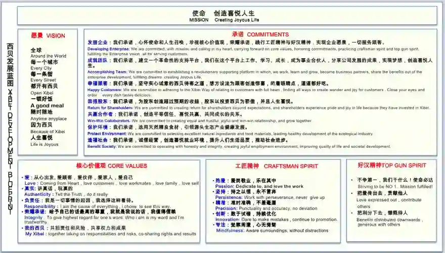 在“西贝蓝图”里,西贝的愿景是“全球每一个城市、每一条街,都开有西贝,一顿好饭、随时随地,因为西贝,人生喜悦”。