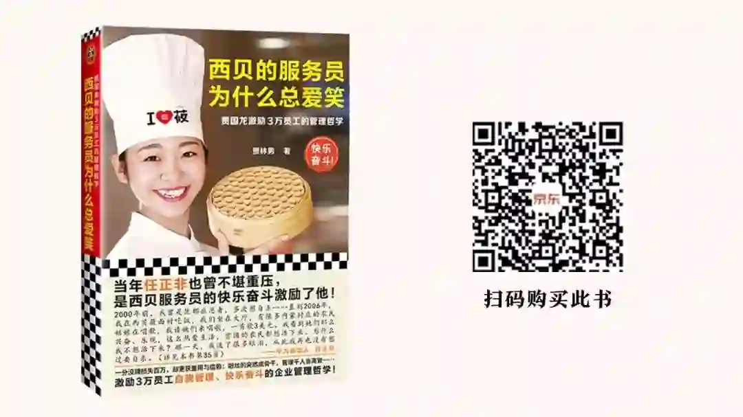 回到《西贝的服务员为什么总爱笑》这本书,书的上中下篇分别用数十个真实发生在西贝的故事,讲述了西贝如何做组织建设,基于“西贝的产品是人”这个出发点,组织如何培养人、激励人、约束人、成就人。