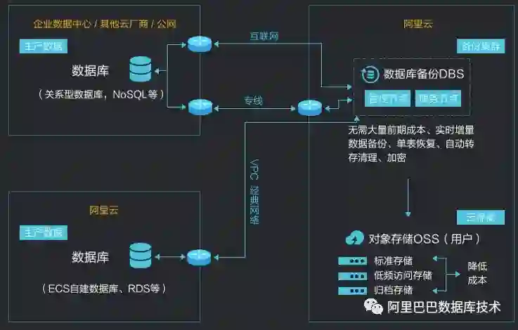 你的数据库在非阿里云的云环境上,如果数据库已开通公网可以使用数据库备份DBS直接备份,或者通过部署代理、开通阿里云专线,都可以使用数据库备份DBS将数据备份到OSS上,在阿里云上做跨云备份
