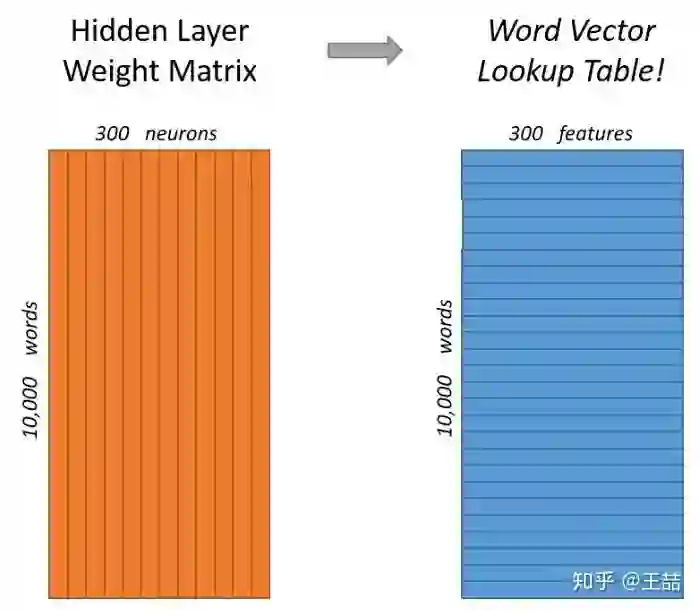 其实就是我们上面所说的输入向量矩阵 中每一行对应的权重向量。于是这个权重矩阵自然转换成了word2vec的lookup table。