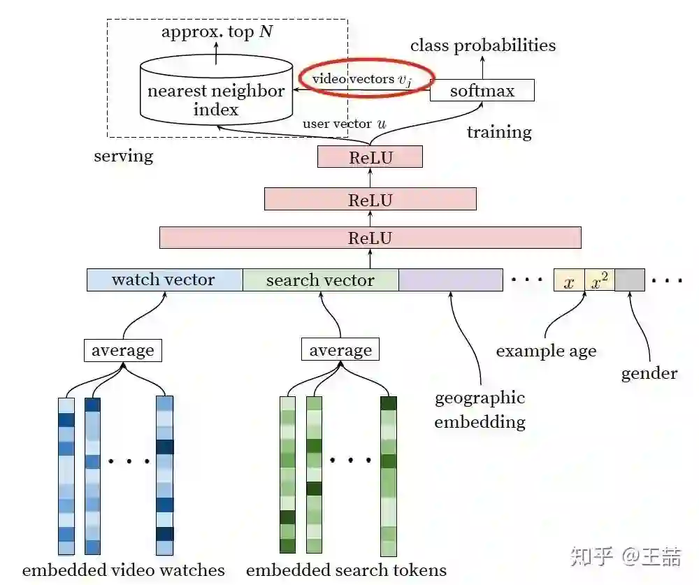 但embedding的应用又远不止于此,事实上,由于我们也可以把输出矩阵的列向量当作item embedding,这大大解放了我们可以用复杂网络生成embedding的能力。读过我专栏上一篇文章YouTube深度学习推荐系统的十大工程问题 的同学肯定知道,YouTube在serve其candidate generation model的时候,只将最后softmax层的输出矩阵的列向量当作item embedding vector,而将softmax之前一层的值当作user embedding vector。在线上serving时不用部署整个模型,而是只存储user vector和item vector,再用最近邻索引进行快速搜索,这无疑是非常实用的embedding工程经验,也证明了我们可以用复杂网络生成user和item的embedding。