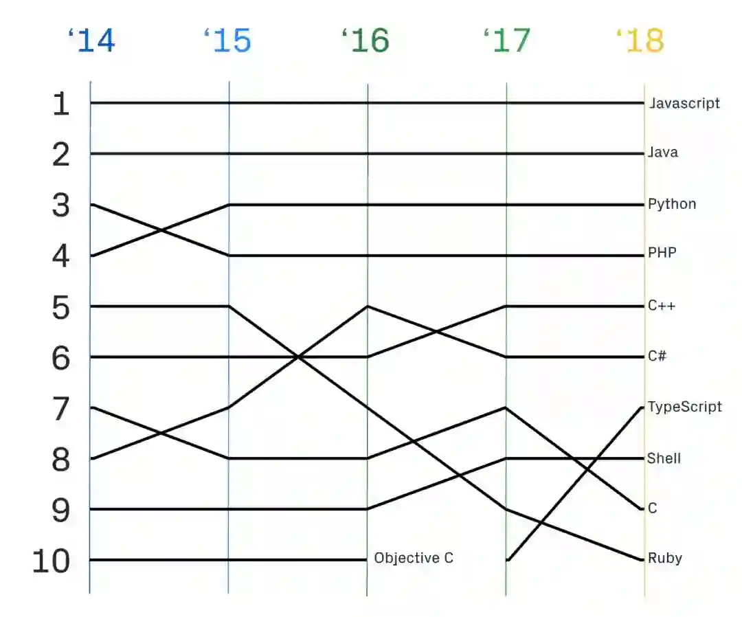 2018 年开发者在 GitHub 上谈论最多的话题包括 JavaScript、机器学习、移动开发、容器等。